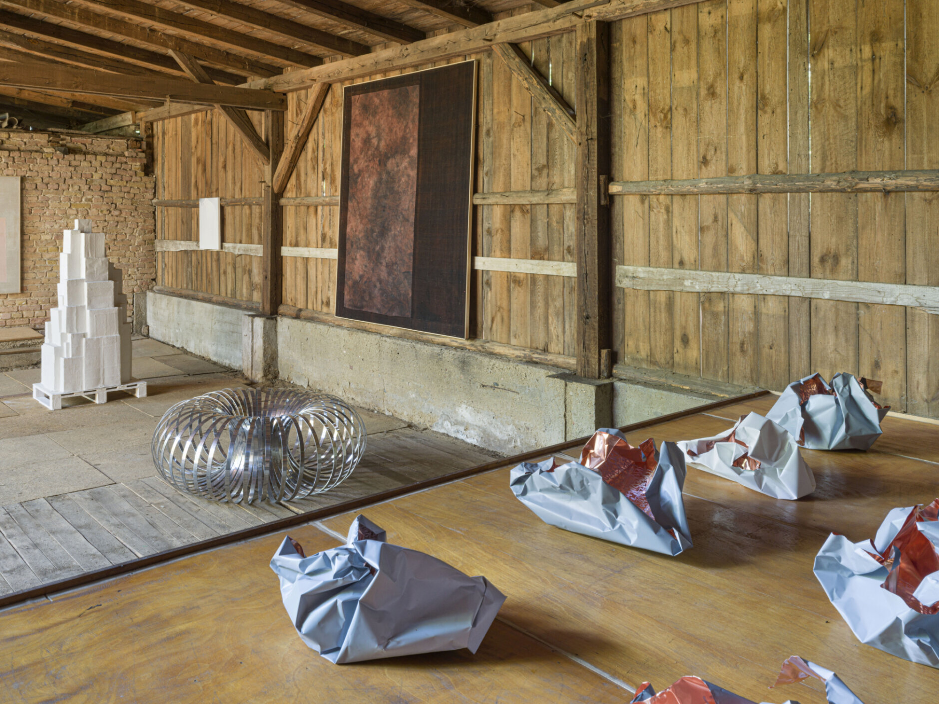 Taking place in a repurposed grain barn, SOFT ARCHITECTURES deals with the material realities that shape our human and non-human entangled relationships. The exhibition designs imaginary spaces, in which structure is defined by memory and experience, rather than walls. The lines dividing interior and exterior are broken down, creating an interplay between organic forms and manufactured materials.